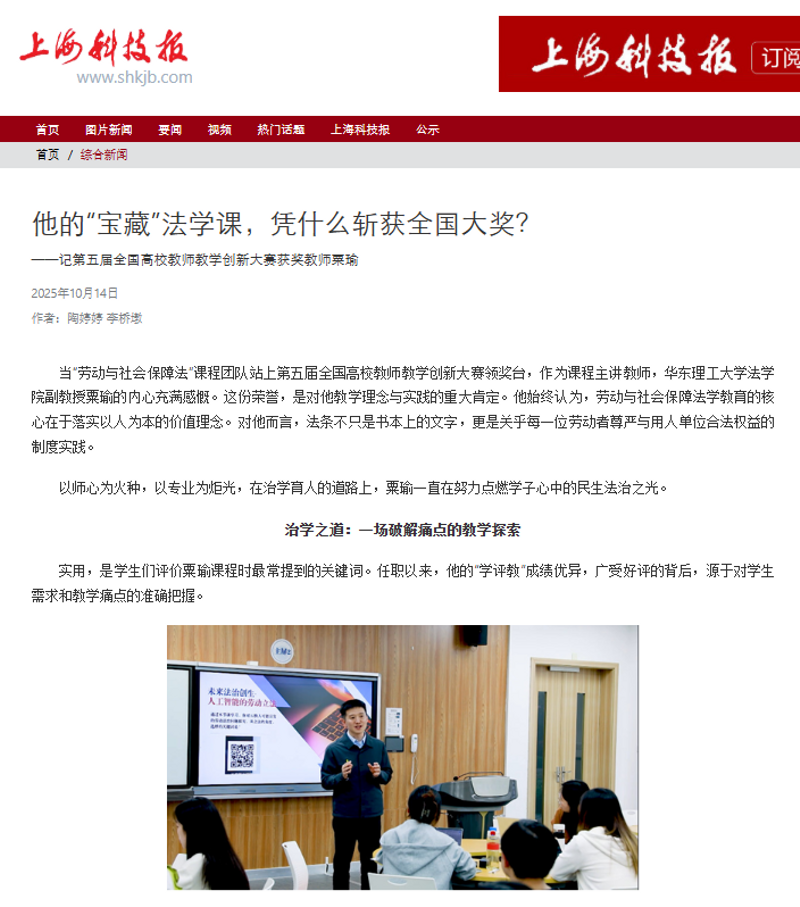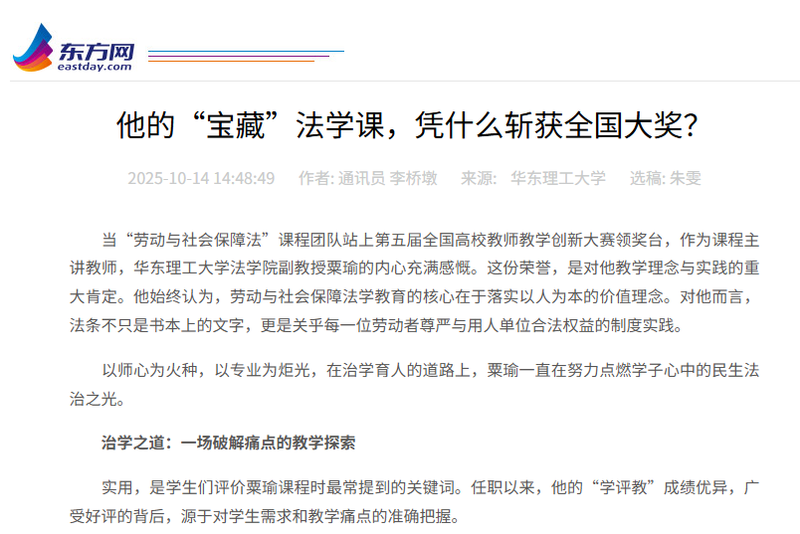 今年8月,第五届全国高校教师教学创新大赛获奖名单公布,华东理工大学“劳动与社会保障法”课程团队获新文科副高组二等奖。课程主讲教师、华东理工大学法学院副教授粟瑜始终认为,劳动与社会保障法学教育的核心,正是在于落实以人为本的价值理念。科学网APP、新民·上观、东方网、上海教育新闻网、上海科技报、第一教育等多家媒体进行了原发报道。本篇选取了部分报道予以转载。