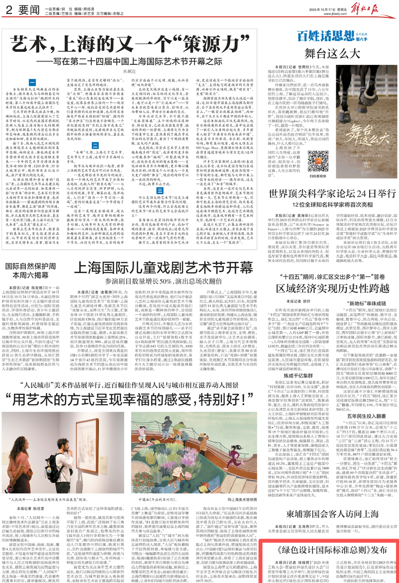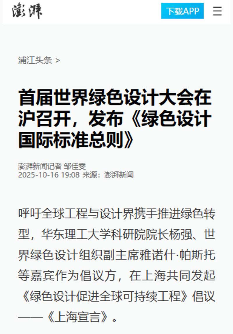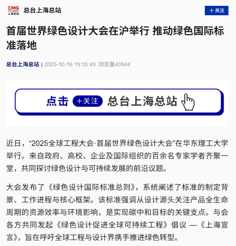 10月14日,“2025全球工程大会·首届世界绿色设计大会”在华东理工大学举行。来自政府、高校、企业及国际组织的百余名专家学者齐聚一堂,共同探讨绿色设计与可持续发展的前沿议题。会上,《绿色设计国际标准总则》发布,《绿色设计学》《2025世界绿色设计发展报告》全球首发。央视新闻客户端、中国教育报客户端、《解放日报》、中国新闻网、澎湃新闻客户端、科学网APP、新民·上观、东方网、劳动观察、上海教育新闻网、上海科技报、上海热线、第一教育、话匣子、广州日报新花城等多家媒体进行了原发报道。本篇选取了部分报道予以转载。