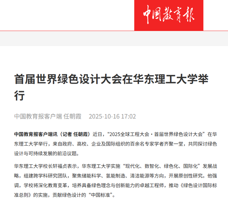 【中国教育报客户端】首届世界绿色设计大会在华东理工大学举行