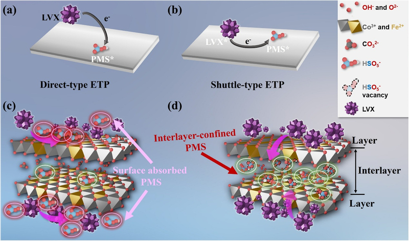 抗生素如左氧氟沙星(LVX)等在水体中的残留已成为全球性环境问题。基于硫酸根自由基的高级氧化工艺虽能有效降解此类污染物,但传统自由基路径存在寿命短、易受水质干扰、氧化剂利用率低等问题。电子转移过程作为一种非自由基路径,具有高选择性、抗干扰性强等优势,但其在实际应用中仍面临电子传递效率低、副反应多等挑战。本研究首次在层状双氢氧化物/过氧单硫酸盐(LDH/PMS)体系中提出了“非接触电子转移过程”(NCETP)。与传统电子转移过程不同,NCETP实现了污染物与氧化剂在催化剂两侧的物理隔离:PMS被限制在LDH层间,而LVX等大分子污染物则吸附在催化剂外表面,两者无法直接接触。研究人员通过巧妙的“记忆效应”与离子交换策略,成功构建了具有HSO₅⁻空位的CoFe LDH催化剂(CLHSO),使其能够优先吸附并锚定PMS于层间。层间限域的微环境不仅提升了PMS的局部浓度,还通过氢桥结构实现了高效的电子传递。实验表明,NCETP过程中的电子转移数量比传统ETP提高了2.58倍,LVX在30分钟内降解率超过95%,且系统在宽pH范围(5~11)和复杂水质条件下仍保持高效稳定。为验证该技术的实际应用潜力,团队构建了以CLHSO负载的聚酯纤维为填料的连续流反应器。在长达24小时的连续运行中,系统对LVX的降解率始终维持在99%以上,且金属浸出浓度远低于国家排放标准。此外,经连续流处理后的染料废水色度显著下降。毒性评估表明,降解产物生态毒性显著低于LVX原药,且处理后的溶液对大肠杆菌具有完全灭活效果,显示出良好的环境友好性。