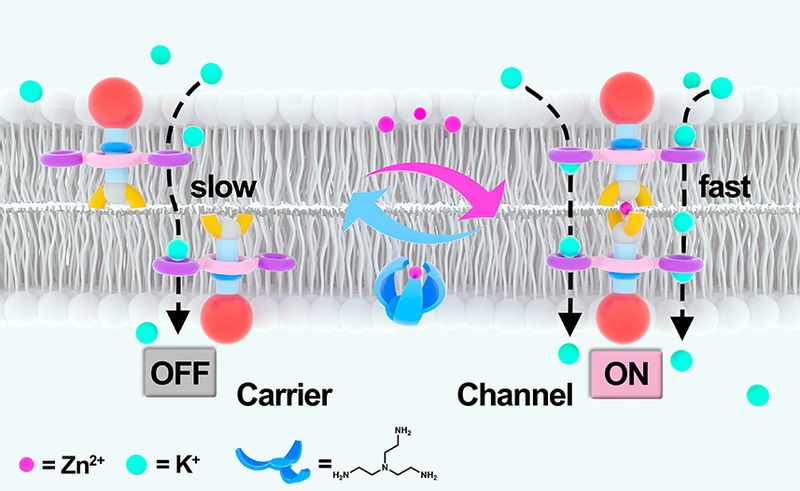 课题组在轮烷分子机器离子传输平台方面具有深厚积累(J. Am. Chem. Soc.2018, 140, 17992),通过互锁组件的机械穿梭实现类通道离子传输,并系统提升了传输效率(Sci.China Mater. 2025, 68, 2973)、离子选择性(Sci. China Chem.2023, 66, 2300)与光调控能力(Angew. Chem. Int. Ed. 2021, 60,14836)。基于此,本研究创新性地提出基于锌离子诱导轮烷二聚化的跨膜传输策略,通过三大核心设计要素的协同作用,成功实现了独特的双态切换功能:(1)不对称两亲滑杆设计:采用亲水四乙二醇头基与疏水锌螯合三联吡啶末端,确保分子在脂质膜中的精确定位与高效嵌入;(2)三环冠醚滑环结构:引入双苯并-18-冠-6-醚单元,增强钾离子选择性并提升单次离子通量,从而显著提高传输效率;(3)滑杆长度优化:将滑杆长度较传统设计缩短50%,为可控构象切换提供关键空间约束。研究显示,单体轮烷长度约2.40纳米,小于脂双层疏水区厚度(约3.0纳米),而二聚体长度可达4.67纳米,其更适于跨膜分布。在无锌离子状态下,系统表现为低活性载体;Zn2+配位后触发三联吡啶介导的二聚化,通过环组件沿滑杆的穿梭接力运动形成连续跨膜路径,实现高效离子通道功能。该系统还可通过Zn2+与三(2-氨乙基)胺(TAEA)的竞争结合实现完全可逆调控,其中TAEA可促使二聚体解离,恢复单体状态。这项研究首次在人工离子通道中,成功模拟了天然ZAC蛋白的“开关”机制,创建了第一个能用锌离子可逆控制通道传输的人工系统。
