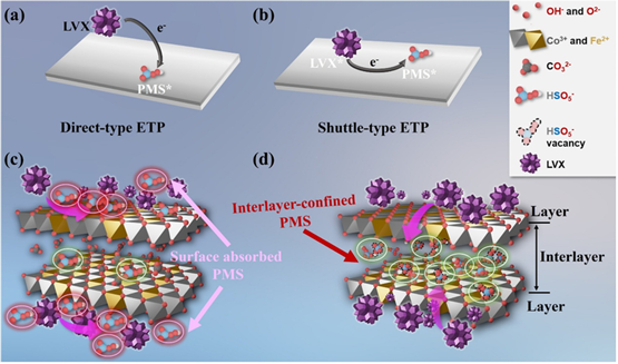 抗生素如左氧氟沙星(LVX)等在水体中的残留已成为全球性环境问题。基于自由基的高级氧化工艺虽能有效降解此类污染物,但传统自由基路径存在寿命短、易受水质干扰、氧化剂利用率低等问题。电子转移过程作为一种非自由基路径,具有高选择性、抗干扰性强等优势,但其在实际应用中仍面临电子传递效率低、副反应多等挑战。本研究首次在层状双金属氢氧化物/过氧单硫酸盐(LDH/PMS)体系中提出了“非接触电子转移过程”(NCETP)。