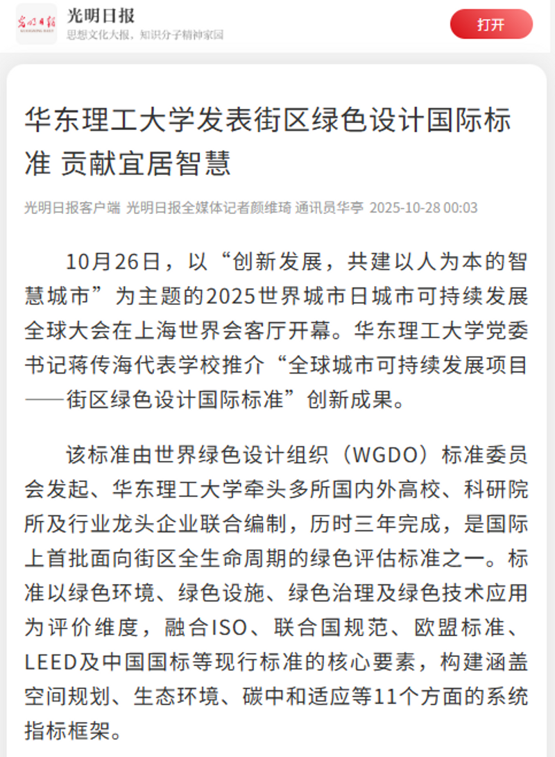 【光明日报客户端】华东理工大学发表街区绿色设计国际标准 贡献宜居智慧