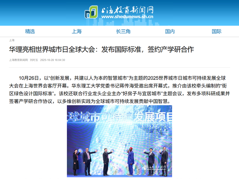 10月26日,以“创新发展,共建以人为本的智慧城市”为主题的2025世界城市日城市可持续发展全球大会在上海世界会客厅开幕。我校党委书记蒋传海受邀出席开幕式,推介由该校牵头编制的“街区绿色设计国际标准”。学校还联合行业龙头企业主办“好房子与宜居城市”主题会议,发布多项科研成果并签署产学研合作协议。央视新闻客户端、光明日报客户端、经济日报客户端、科学网、东方网、上海教育新闻网、第一教育、上海科技报、话匣子等近10家媒体进行了原发报道。本篇选取了部分报道予以转载。