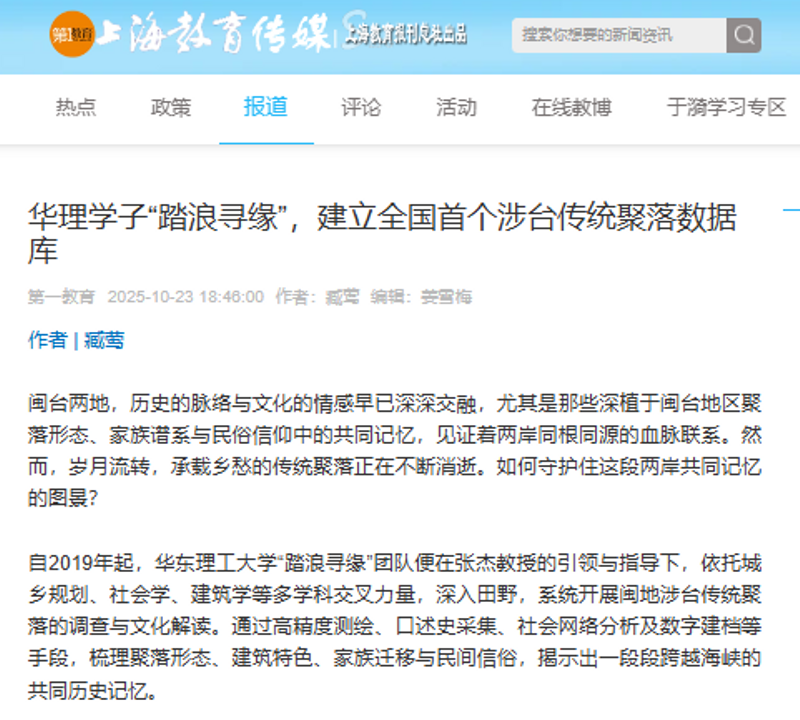 自2019年起,华东理工大学“踏浪寻缘”团队便依托城乡规划、社会学、建筑学等多学科交叉力量,深入田野,系统开展闽地涉台传统聚落的调查与文化解读。通过高精度测绘、口述史采集、社会网络分析及数字建档等手段,梳理聚落形态、建筑特色、家族迁移与民间信俗,揭示出一段段跨越海峡的共同历史记忆。人民日报客户端、光明日报客户端、中国新闻网、解放·上观、第一教育、新民周刊等媒体进行了原发报道。本篇选取了部分报道予以转载。