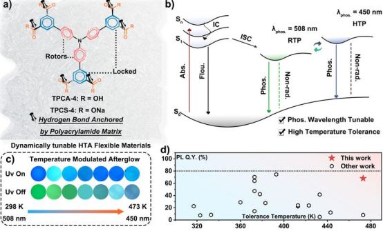 图. a) 氢键锚定作用与单键转子结构耦合策略示意图;b)动态高温余辉现象的Jablonski示意图与c)实际照片展示;d)目前高温耐受型柔性磷光聚合物材料的研究进展。