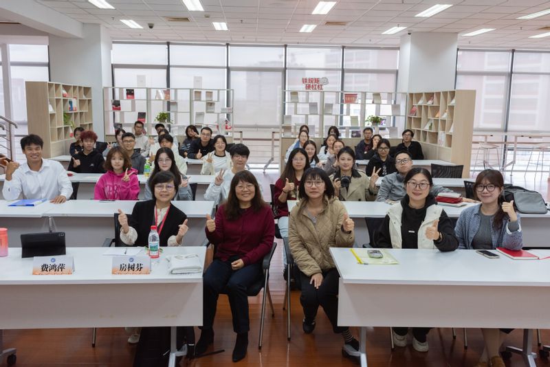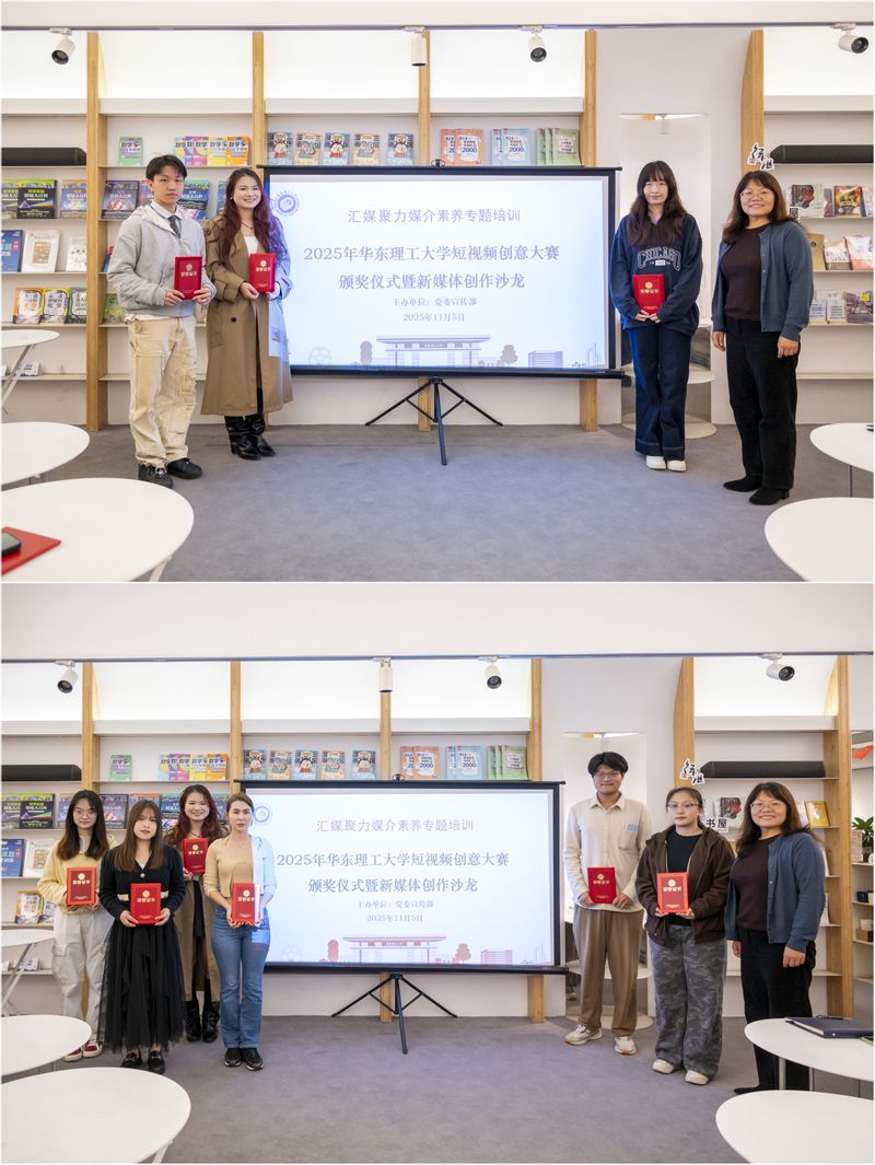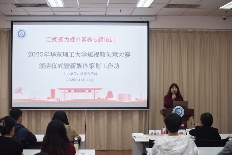 11月11日,由党委宣传部主办的“汇媒聚力媒介素养专题培训——2025年华东理工大学短视频创意大赛颁奖仪式暨新媒体策划工作坊”在图文信息中心至善书苑举行。商学院费鸿萍教授应邀作新媒体选题指导,党委宣传部副部长房树芬,党委宣传部工作人员以及学生记者、短视频创意大赛获奖学生等30余人参加了活动。