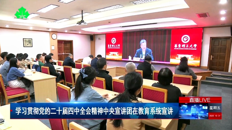 10月30日,学习贯彻党的二十届四中全会精神中央宣讲团在教育系统宣讲,中央宣讲团成员,教育部党组书记、部长怀进鹏作宣讲报告。华东理工大学校领导班子成员、思政课教师、辅导员聆听报告。
