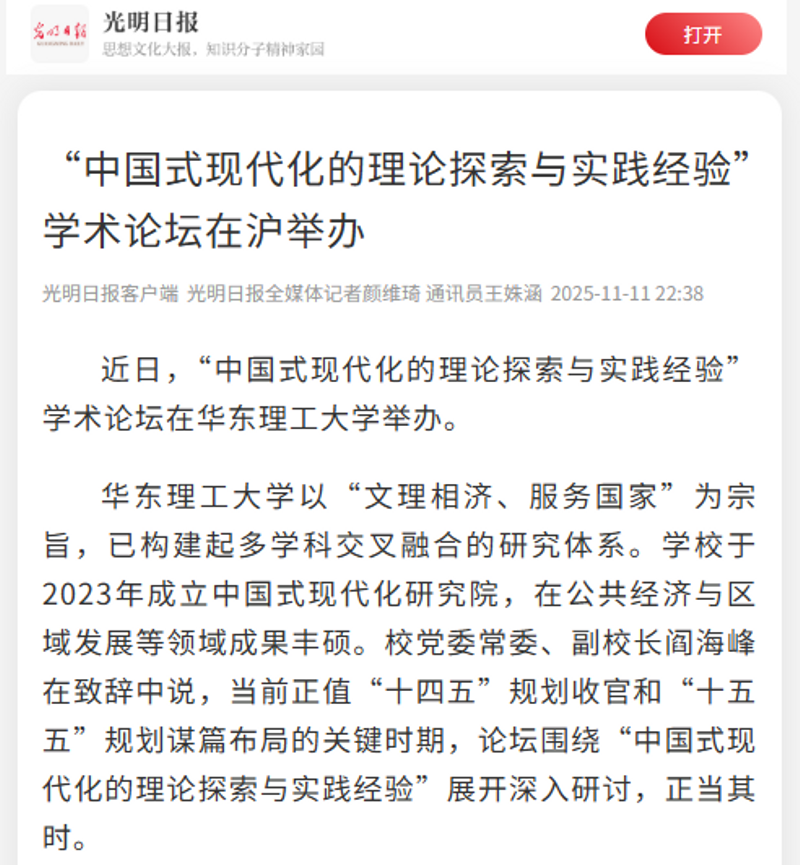 11月7日,“中国式现代化的理论探索与实践经验”学术论坛在华东理工大学徐汇校区举办。本次论坛围绕“中国式现代化的理论探索与实践经验”展开深入研讨。光明日报客户端、中国新闻网、科学网APP、中国社会科学网、东方网、上海教育新闻网、第一教育、上海科技报、话匣子等多家媒体,对此进行了原发报道。本篇选取部分报道予以转载。