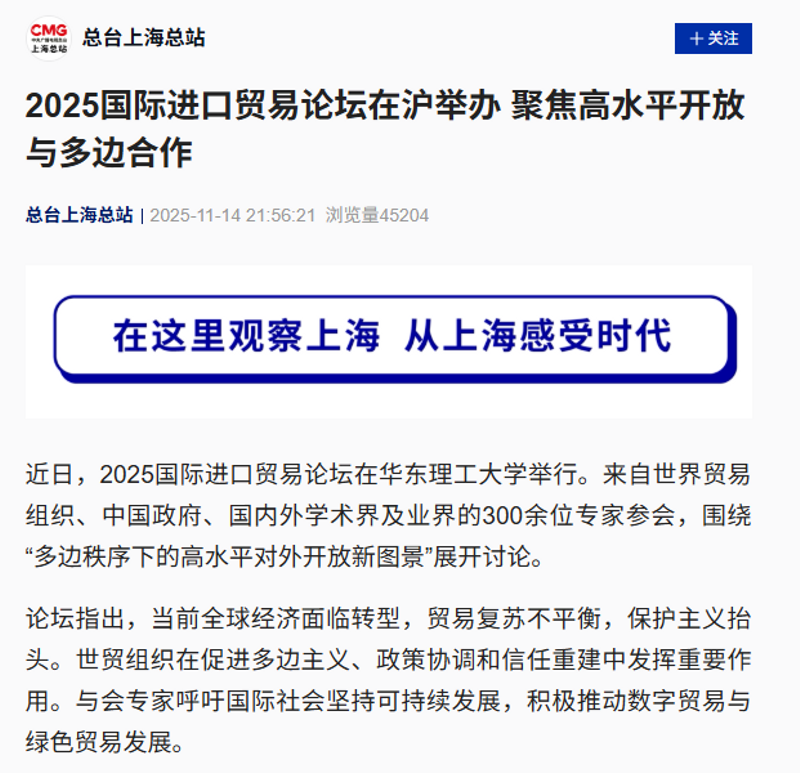 11月8日,2025国际进口贸易论坛在华东理工大学举办。来自国际组织、中国政府、学界和业界的300余位专家学者应邀出席论坛并作主旨演讲。央视新闻客户端、光明日报客户端、中国新闻网、经济日报客户端、科学网APP、中化新网、新民·上观、第一教育、上海教育新闻网、广州日报新花城等10余家媒体,对此进行了原发报道。本篇选取部分报道予以转载。