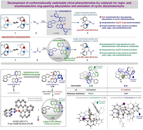 张志鹏教授/岑守义老师团队以不对称催化和手性分子的合成为主要研究方向,长期致力于原创性新型手性催化剂的设计、发展和应用研究。为了开发不对称催化合成含炔烃结构的轴手性联芳基化合物的新方法,该团队设计发展了一种原创性的构象可切换的轴手性菲咯啉铜催化剂,利用该催化剂首次实现了联芳基碘鎓盐的高对映选择性开环炔基化反应;同时,也以酰胺或者草酰胺为亲核试剂,实现了联芳基碘鎓盐的高对映选择性开环胺化。机理研究证明,催化剂活性中心远端的大位阻取代基团以及配体中酚氧负离子与碘鎓盐之间的离子对相互作用,是实现高对映选择性炔化反应的关键。而在胺化反应中,具有不同优势构象的轴手性菲咯啉配体所提供的不同的手性环境,是影响反应对映选择性的关键因素。该研究不仅为含炔烃结构的轴手性联芳基化合物的不对称催化合成提供了一种新方法,更揭示了手性催化剂的柔性和构象在不对称催化中的重要性。