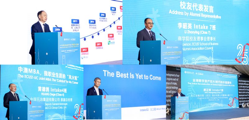 在校友代表发言环节,华东理工大学商学院校友理事会理事长李昭英、中国五冶集团有限公司原副总经理黄德鸽、山东键邦新材料股份有限公司总裁王卫星、长江金融控股(武汉)股份有限公司董事长兼CEO郝正明,结合各自职业历程,分享了在中澳MBA项目中的学习经历对其职业发展的深刻影响,并围绕数字化、AI、企业转型等前沿议题展开深入探讨。
