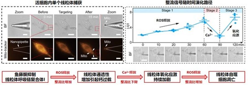 课题组实现了在单个活细胞中对单个线粒体的靶向捕获,对线粒体多种信号(Ca2+ /ROS / H+)的时序性释放进行原位响应,实现了鱼藤酮刺激下单个线粒体内源性化学信号的原位时序性响应测量。尽管细胞内环境复杂,但人工纳米通道仍能在局部亚细胞区域对复杂的化学信号进行测量。