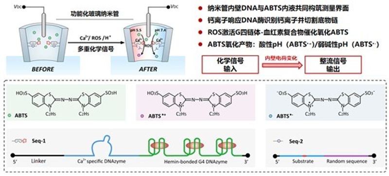 课题组研究人员设计了一种基于化学门控人工纳米通道的动态测量新策略,通过在玻璃纳米管内表面修饰DNA功能结构来实现跨膜通道的整流性质转换。DNA链的空间结构和电荷可通过多种关键化学信号进行智能调节。Seq-1包含用于纳米管内壁附着的连接部分(Linker)、钙离子响应DNA酶(CD)、G四链体-血红素复合物(HG4)三部分,Seq-2包含与Seq-1中CD部分对应的底物(Substrate)以及一段随机DNA序列(RD)两部分。CD和Substrate序列互补,Seq-1和Seq-2在纳米管内壁形成Seq-1/Seq-2二聚体(dsDNA)。用含ABTS,即2, 2’-联氮-双(3-乙基苯并噻唑啉-6-磺酸)的电解质溶液填充玻璃纳米管,建立多重化学信号响应的测量界面。Ca2+激活CD切割底物,导致Seq-2的3’端片段脱落。HG4可以催化ROS介导的ABTS氧化,在酸性pH下生成ABTS•+或在中性/弱碱性pH下氧化为ABTS•-。Ca2+触发的底物裂解以及HG4催化氧化ABTS引起纳米管内壁电荷变化,通过离子电流整流(ICR)进行实时监测。