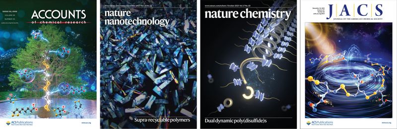 在动态二硫聚合物的可控合成与组装方面,在国际上率先报道了“酸催化二硫可逆开环聚合”(ACIE,2023, 62, e202215329),填补了聚二硫在阳离子聚合方法上的空白,实现了超快、无需惰性气体保护的二硫开环聚合,将聚二硫的分子量提升到百万级别。通过单体预组装晶体工程调控策略,开发了“二硫拓扑单晶聚合”(JACS,2025, 147, 42743)的晶态合成新方法,合成出了首例单晶聚二硫(CCDC:2479995),推动聚二硫迈向原子精准可控合成。进一步协同非共价组装与动态共价聚合,合成了在溶液中能够像生物大分子一样发生可逆构象折叠的螺旋聚二硫(Nat.Chem. 2025, 17, 1462),并将聚合物的动态折叠(构象)与可逆聚合(构型)协同到一个平衡体系,定量描述了动态共价-非共价相互作用的协同性,为双动态化学系统的可预测热力学模型奠定了理论基础。该工作入选NatureChemistry期刊当期封面。