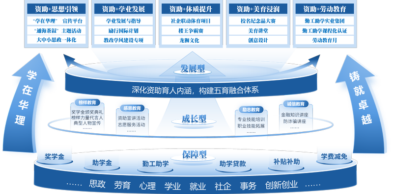 近年来,学校紧紧围绕立德树人根本任务,构建“资助+”五育融合育人体系,推动学生资助从基础保障向发展赋能系统转型,将经济支持转化为精神引领、能力提升和人格塑造,助力学生全面发展。理念上,超越单纯的经济帮扶,确立“资助为基、育人为本、发展为要”的核心观念,将资助视为促进学生全面发展的重要载体。逻辑上,构建“保障—支持—发展—反哺”的递进式育人链条,形成“解困—育人—成才—回馈”的良性循环,使资助工作有机融入人才培养全过程。路径上,以“资助+”育人模式为平台,通过“资助+德育”“资助+智育”“资助+体育”“资助+美育”“资助+劳育”等融合路径,系统设计并实施发展型资助项目,将经济支持转化为能力提升、精神激励和价值观塑造,实现从“助人”到“育人”、从“输血”到“造血”、从“保障学业”到“赋能成长”的跨越。
