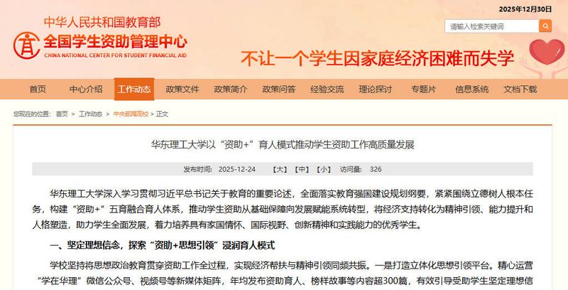 近日,教育部全国学生资助管理中心官网以“华东理工大学以‘资助+’育人模式推动学生资助工作高质量发展”为题,对我校学生资助工作育人成果进行了报道。