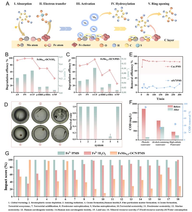 邢明阳教授团队成功构筑了一种兼具铁团簇与氧配位钼单原子位点的双金属位点催化剂,有效克服了传统芬顿技术在高盐环境及极端 pH 条件下易受干扰的难题,实现了难降解有机污染物的可持续去除。通过双活性位点与污染物及氧化剂间的协同电子转移,高效促进PMS活化生成单线态氧(1O2)与吸附态硫酸根自由基(SO4•–ads)。其中,1O2具有较长寿命,可长程迁移将溶液中的酚类污染物氧化为羟基化中间产物,提升其极性,进而促进中间体向催化剂表面迁移,再经SO4•–ads攻击实现开环与矿化,从而避免了污染物在催化剂表面累积。通过原位表征实验和固液界面传质过程模拟以及斑马鱼毒性评估实验,团队进一步揭示了1O2与SO4•–ads间的协同低毒化控制机制。全生命周期评估结果显示,与传统芬顿体系相比,该体系在环境可持续性与成本效益方面更具优势,且金属浸出量极低。本研究揭示了界面电子相互作用在催化设计中的关键作用,为开发持久、环保的废水处理技术提供了可扩展策略。相关研究成果以“Harnessing Fe–Mo atomic interfaces forboosted electron transfer and ROS generation in sustainable pollutant degradation”为题,发表在 Environmental Science &Technology上,并入选期刊主封面文章。该成果以华东理工大学为第一通讯单位,化学与分子工程学院博士研究生梁丽虹为第一作者,化学与分子工程学院邢明阳教授和姜越特聘副研究员为共同通讯作者。