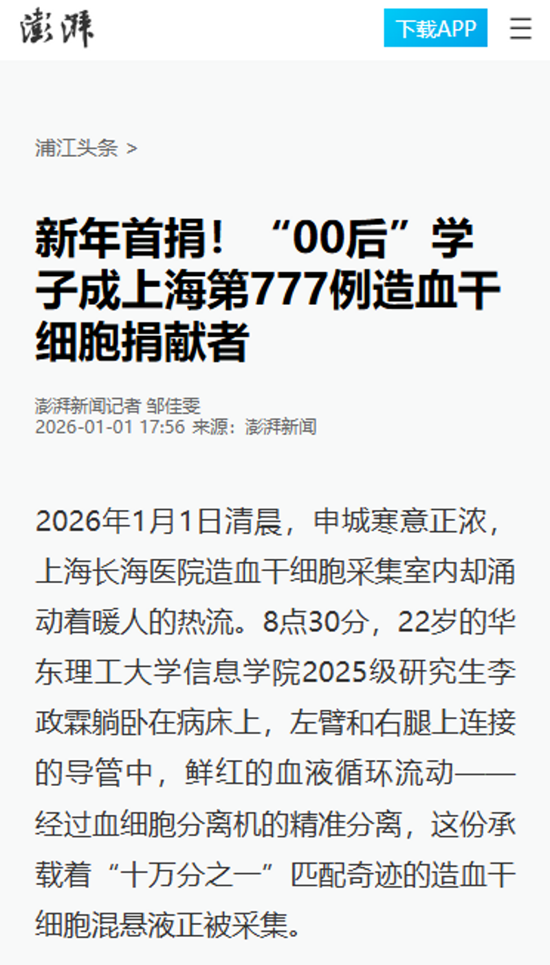 【澎湃新闻】新年首捐!“00后”学子成上海第777例造血干细胞捐献者