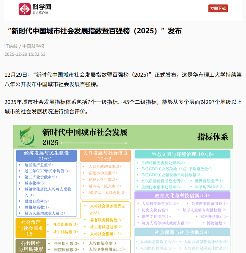 12月29日,“新时代中国城市社会发展指数暨百强榜(2025)”正式发布,这是华东理工大学持续第八年公开发布中国城市社会发展百强榜。