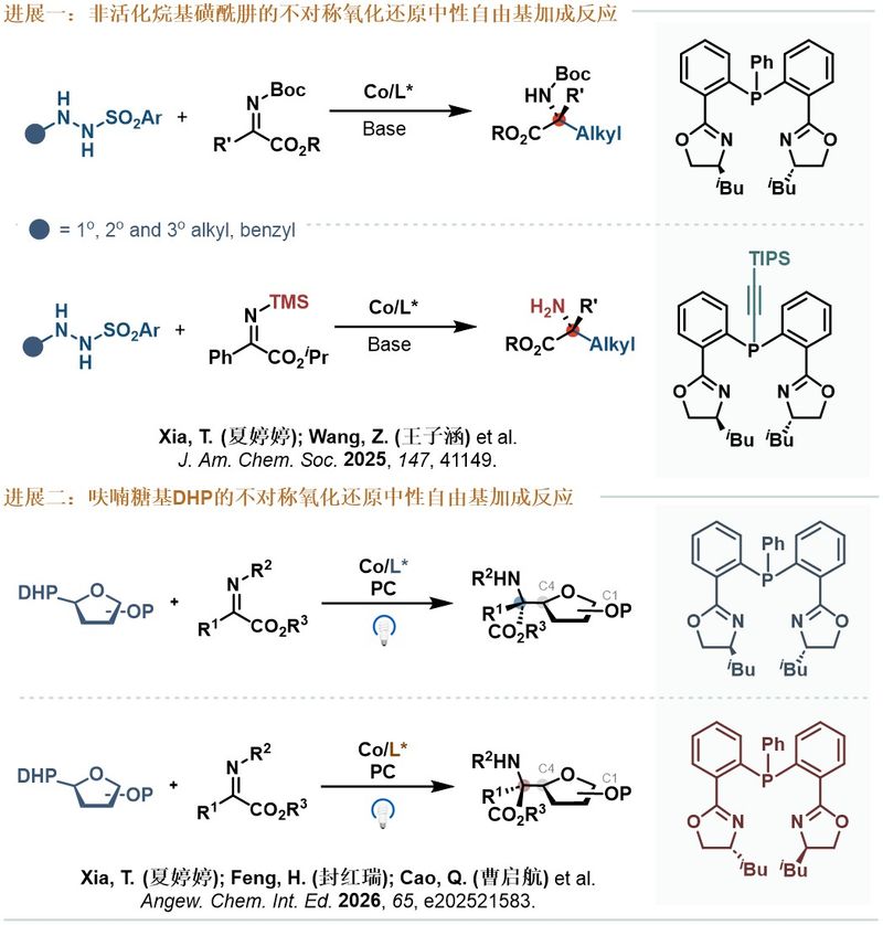 进展一:实现了钴催化非活化烷基磺酰肼与亚胺的不对称氧化还原中性自由基加成反应,高效、高对映选择性地合成了手性α-氨基酯类化合物。需要指出的是,该反应体系首次实现了N-三甲基硅基亚胺酯的不对称自由基加成,并通过原位脱硅过程,一锅法合成手性游离胺类产物,进一步提高了该反应合成应用价值。