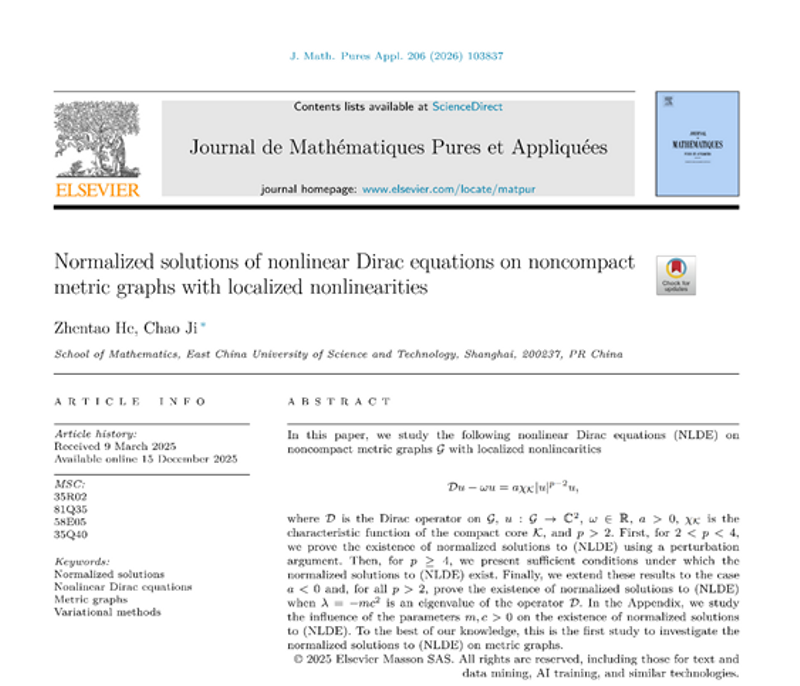 近日,数学学院姬超教授与其博士研究生何镇涛在非线性偏微分方程领域取得重要研究进展。其合作论文《Normalized solutions of nonlinear Dirac equations on noncompact metric graphs with localized nonlinearities》发表于数学领域国际权威期刊Journal de Mathématiques Pures et Appliquées(2026年第206卷)。该期刊创刊于1836年,由法国著名数学家Joseph Liouville创办,是现存历史第二悠久的国际数学期刊,在数学界享有崇高的学术声誉。