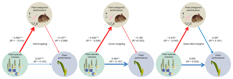 在将陆地生态系统划分为农业系统、草原与森林系统后研究发现,植物多样性在这三个系统中均能直接促进植物生产力提升,但农业系统中作物多样性通过抑制植物病虫害来增加作物产量的间接效应尤为显著,而草原和森林系统则未表现出显著的控害间接增产效果(图2)。