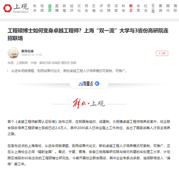 【解放·上观】工程硕博士如何变身卓越工程师?上海“双一流”大学与3省份高研院连招联培