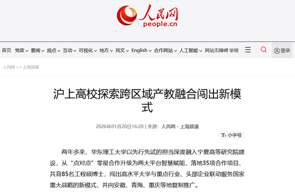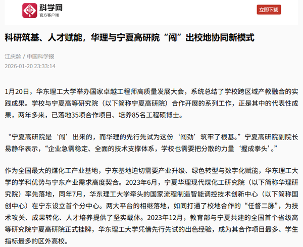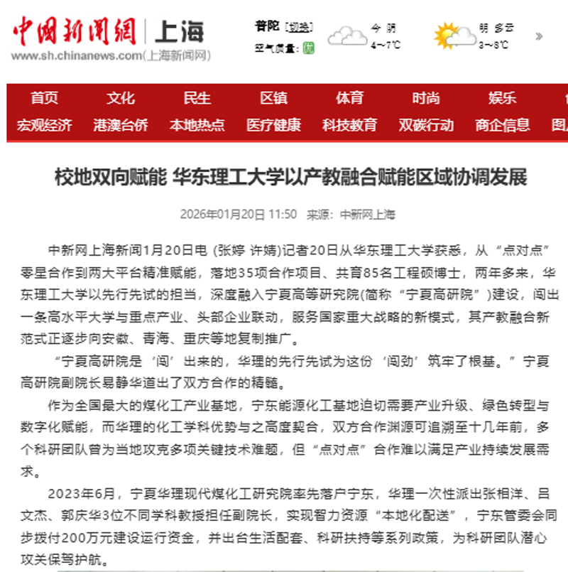 中新网上海新闻1月20日电 (张婷 许婧)记者20日从华东理工大学获悉,从“点对点”零星合作到两大平台精准赋能,落地35项合作项目、共育85名工程硕博士,两年多来,华东理工大学以先行先试的担当,深度融入宁夏高等研究院(简称“宁夏高研院”)建设,闯出一条高水平大学与重点产业、头部企业联动,服务国家重大战略的新模式,其产教融合新范式正逐步向安徽、青海、重庆等地复制推广。