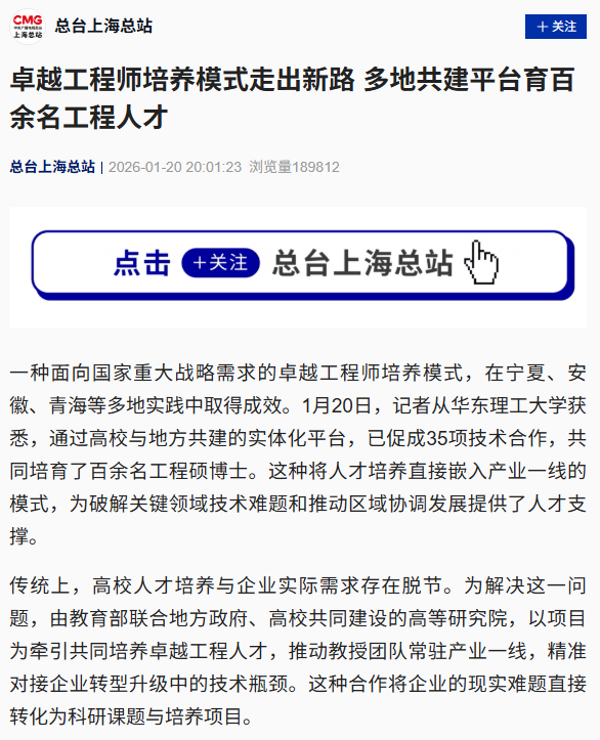 一种面向国家重大战略需求的卓越工程师培养模式,在宁夏、安徽、青海等多地实践中取得成效。1月20日,记者从华东理工大学获悉,通过高校与地方共建的实体化平台,已促成35项技术合作,共同培育了百余名工程硕博士。这种将人才培养直接嵌入产业一线的模式,为破解关键领域技术难题和推动区域协调发展提供了人才支撑。