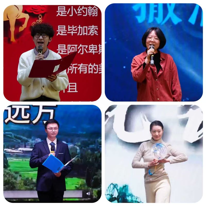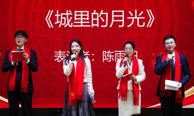 当天下午,外国语学院举办了以“语贺新春,言启宏程”为主题的2026年迎新活动。现场气氛热烈,年味浓浓。入场处,大学英语教学部郭敬维带领大家在年历上挥毫写福、笔墨迎新。学院领导班子与党政办公室教师一同带来开场舞蹈《新年快乐》,展现出行政团队的活力与风采。德语系陈雨田和校友赵俊的独唱、日语系冯思途与大学英语教学部聂士聪的朗诵、王英杰独舞等节目接连上演,赢得了阵阵掌声。
