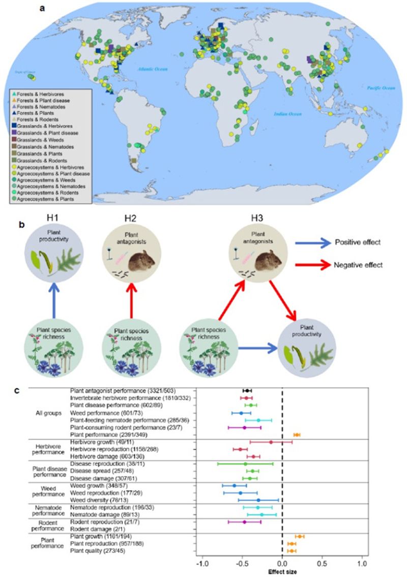 这项由华东理工大学万年峰教授团队牵头、联合全球9国18个机构科研人员完成的重磅研究,近日发表在《自然·生态与演化》(Nature Ecology & Evolution)上。华东理工大学为第一完成单位且唯一通讯单位。研究分析了来自全球609项实验、5712组数据,覆盖农田、草原、森林三大生态系统,横跨热带与温带,在全球尺度上证实:植物多样性种植不仅能直接促进植物增产,更能通过抑制植物病虫害间接提升作物产量,为发展高效生态农林业与草业提供了兼具科学创新性与实践可行性的全新路径。