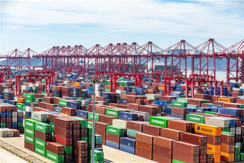 Caption: Containers are stacked at a busy terminal at Shanghai Port, as cargo ships berth and trucks shuttle in and out during peak operations.