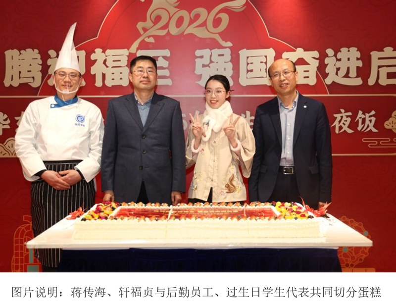 年夜饭现场,蒋传海、轩福贞与厨师、学生代表一同切分新年生日蛋糕,这款香甜的蛋糕由留校学子与后勤大厨携手制作而成,既承载着学校对师生的美好祝愿,更见证了学校劳动教育的生动实践。