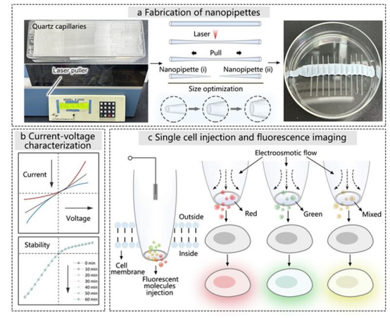 电化学分析是本科分析化学课程的核心教学内容之一。李大伟、钱若灿团队结合本科实验教学特点,开发了面向高年级本科生的研究型综合实验课程,构建以玻璃纳米管为核心的科研训练模块,将前沿纳米电化学与单细胞操控技术引入本科教学体系,为学生提供从器件制备、表征测试、数据采集到数值模拟的完整训练链条。本研究设计的综合性实验项目,采用拉制法制备尖端直径约100 nm的锥形玻璃纳米电极,并将其作为可控递送平台,实现单细胞水平荧光成像。纳米电极内填充荧光探针溶液,经显微操作精准穿刺目标细胞,插入胞质;通过施加恒定电压,驱动荧光分子定向可控地释放至特定亚细胞位点。教学过程系统开展了电极灌注动力学建模、电渗流速率仿真及胞内荧光标记效率评估,深入阐释了该技术的电化学机制。上述教学课程不仅覆盖从实验方案设计、仪器操作、数据采集到定量分析与结果解读的完整教学流程,更着力培养学生跨学科知识整合能力、严谨的科学思维及规范的实验素养。通过实践,学生显著提升了精密微纳操作技能,并深化了对电化学界面过程、离子输运原理及其在活细胞分析中应用的理解。
