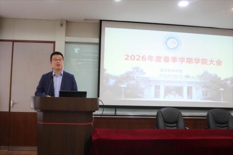 3月3日下午,继续教育学院在综合五楼227室召开2026年春季学期学院大会。学院党委书记沈悦萍,党委副书记、院长陈锋,副院长董玉国、沈文君及全体教师参加。会议由陈锋主持。