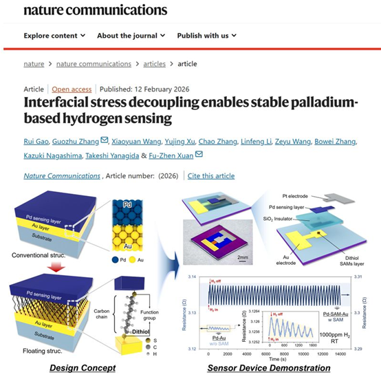 近日,华东理工大学机械与动力工程学院轩福贞教授团队在高性能MEMS氢气(H2)传感器领域取得重要进展。相关研究成果在线发表于国际知名学术期刊《自然—通讯》上。该研究通过引入双硫醇自组装单分子层(SAM)界面工程,提出了一种新型悬浮结构氢气传感器架构设计,为实现高可靠性、高灵敏度的室温氢气检测提供了全新解决方案。