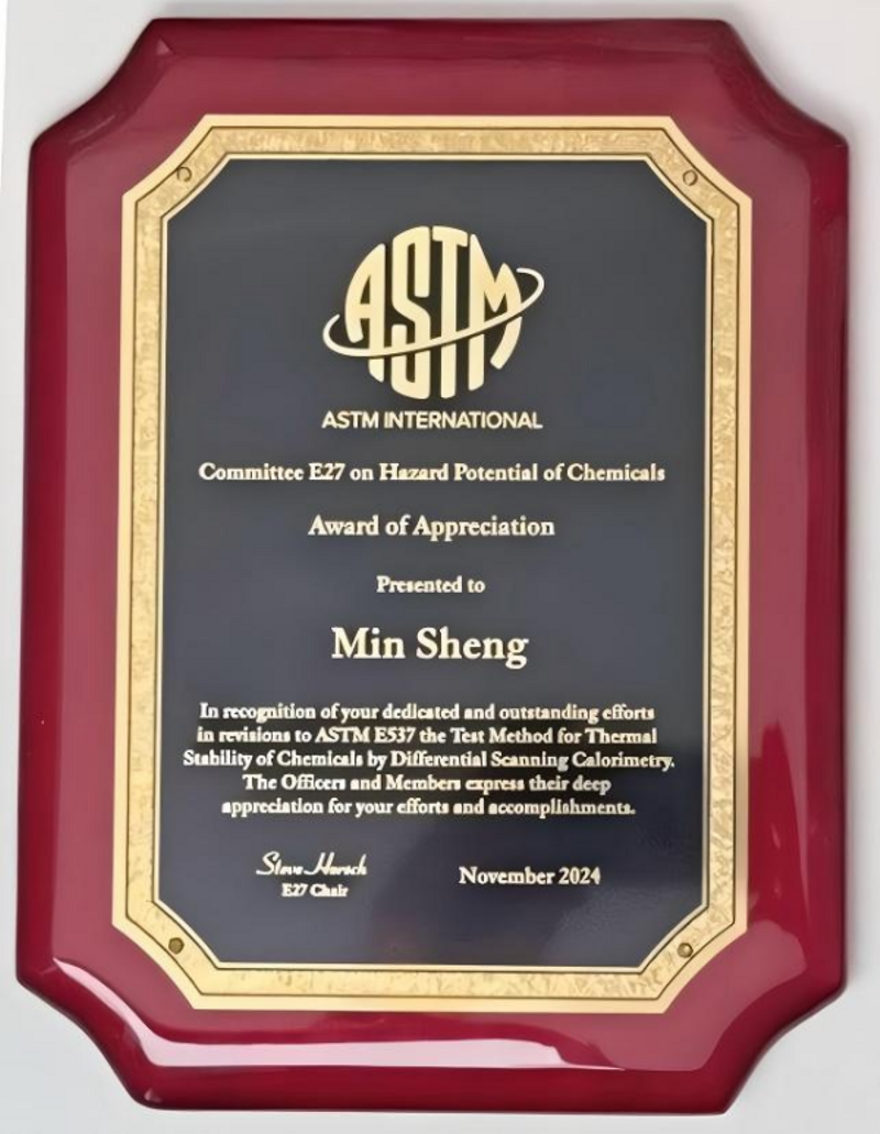 值得关注的是,盛敏教授牵头制定的中国化学品安全协会于2025年7月28日发布实施了团体标准《化学品热稳定性的测试方法 绝热加速量热法》(T/CCSAS 057—2025)。本次由ASTM Committee E27(美国材料与试验协会危险化学品委员会)归口管理的国际标准ASTM E1981-26全文引用了中国化学品安全协会的团体标准T/CCSAS 057—2025,这也是“首次”化学品安全相关的国际标准全文参考我国相关标准制定,相关报道详见中国化学品安全协会近期新闻。