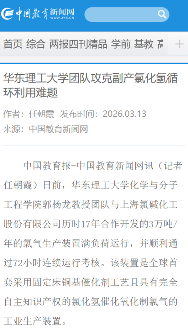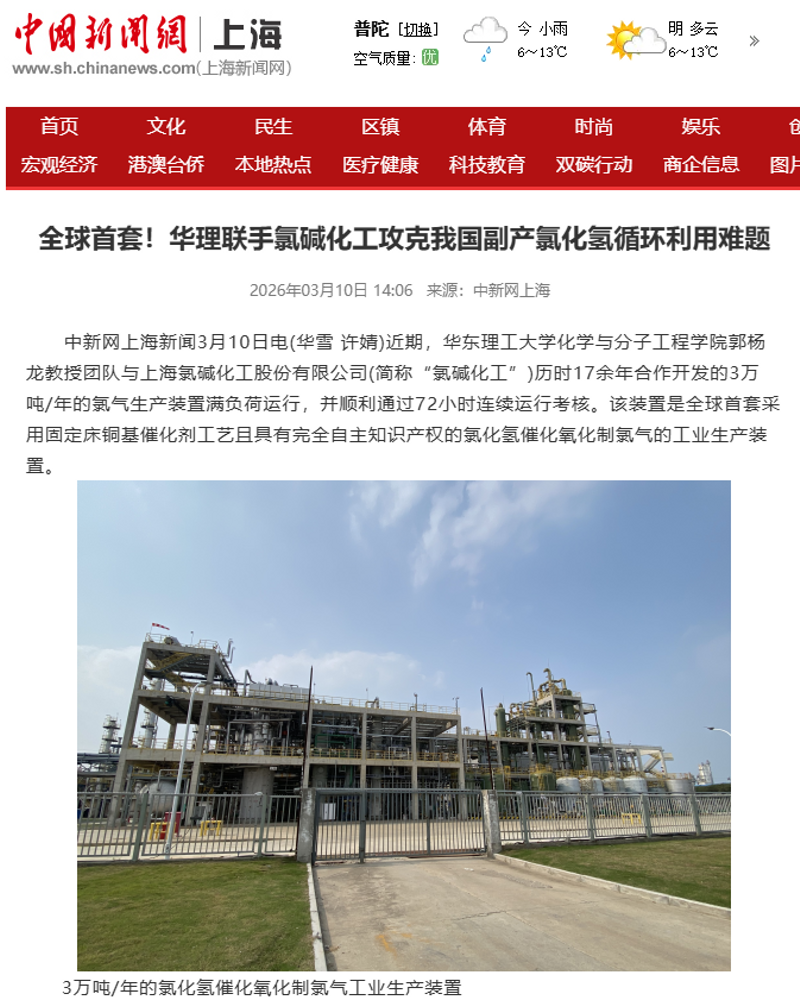 近日,我校化学学院郭杨龙教授团队与上海氯碱化工股份有限公司历时17余年合作开发的3万吨/年的氯气生产装置满负荷运行,并顺利通过72小时连续运行考核。该装置是全球首套采用固定床铜基催化剂工艺且具有完全自主知识产权的氯化氢催化氧化制氯气的工业生产装置。中国教育新闻网、中国青年报客户端、解放·上观、《中国科学报》、中国新闻网、科学网APP、中化新网、新民·上观、东方网、新民周刊、上海教育新闻网、上海科技报、话匣子、第一教育、广东日报新花城等10余家媒体进行了原发报道。本篇选取了部分报道予以转载。