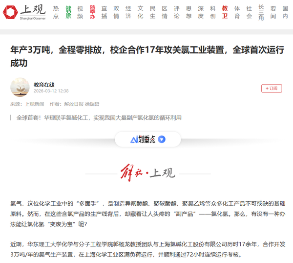 【解放日报】年产3万吨,全程零排放,校企合作17年攻关氯工业装置,全球首次运行成功
