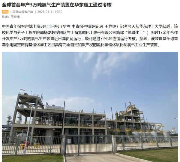 中国青年报客户端上海3月11日电(华雪 中青报·中青网记者 王烨捷)记者今天从华东理工大学获悉,该校化学与分子工程学院郭杨龙教授团队与上海氯碱化工股份有限公司简称“氯碱化工”)历时17余年合作开发年产3万吨的氯气生产装置近日满负荷运行,顺利通过72小时连续运行考核。据悉,该装置是全球首套采用固定床铜基催化剂工艺且具有完全自主知识产权的氯化氢催化氧化制氯气工业生产装置。
