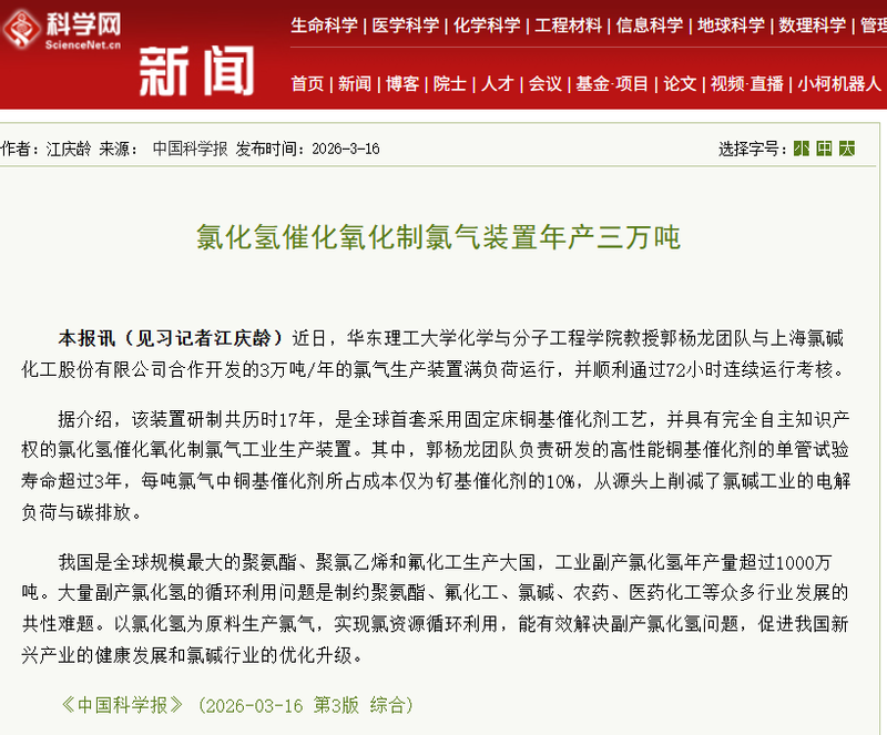 《中国科学报》:氯化氢催化氧化制氯气装置年产三万吨