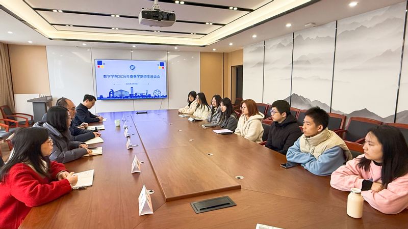 为扎实开展树立和践行正确政绩观学习教育,深入了解学生需求,切实解决急难愁盼问题,3月19日,数学学院召开2026年春季学期师生座谈会。学院党委书记鲍亮、院长林辉球、党委副书记王帅、分管研究生工作的教师代表和应用统计专业研究生代表参加会议。会议由王帅主持。