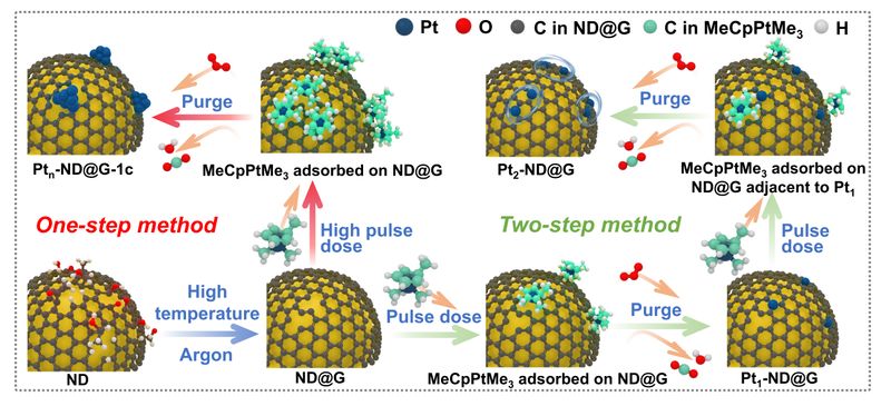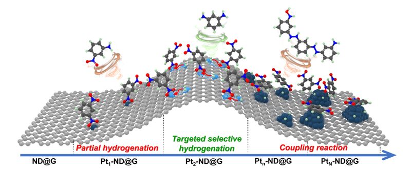 硝基化合物加氢是高值化学品制造领域的核心过程,其关键在于实现多官能团分子中硝基的选择性活化,以定向合成苯二胺等重要中间体。尽管负载型铂族金属催化剂因优化的d带结构具有优异加氢活性,但在硝基化合物多步还原过程中,硝基逐级还原产生的电子屏蔽与空间位阻会抑制中间体的连续转化,难以兼顾反应活性与目标产物选择性。先前研究表明,通过调控活性位点至原子级分散状态,可显著提升金属利用率,但孤立位点对氢气的解离能力不足往往成为制约催化性能的关键瓶颈(AIChE J. 2024, 70, e18278; ACS Catal. 2025, 15(14), 12365)。为此,研究团队基于双原子位点协同催化策略,在纳米金刚石-石墨烯载体上构筑了具有非键合特征的高密度缺电子Pt2位点,实现了硝基化合物吸附与氢气活化的位点解耦,显著提升了硝基化合物的选择性加氢性能。