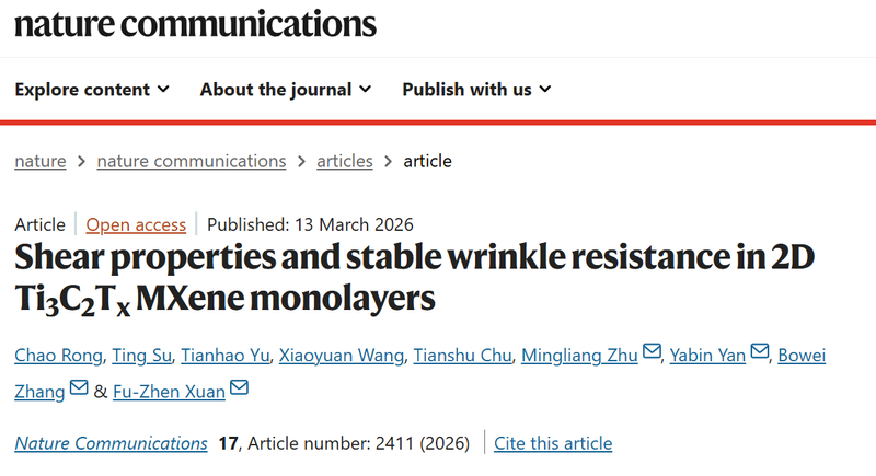 近日,我校机械与动力工程学院轩福贞教授团队在《自然·通讯》上发表了题为“二维Ti3C2Tx MXene单层纳米片的剪切性能和稳定抗皱特性”的研究论文,报道了该课题组在Ti3C2Tx基柔性传感材料结构强度领域的最新研究进展,首次通过扫描透射电子显微镜并结合分子动力学模拟、第一性原理计算在原子尺度观察到二维材料剪切载荷下的损伤起源,打破了人们对二维材料剪切失稳的传统认知。