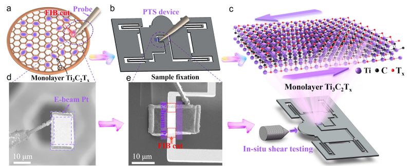 图片说明:利用MEMS装置实现对单层Ti3C2Tx纳米片的面内剪切测试