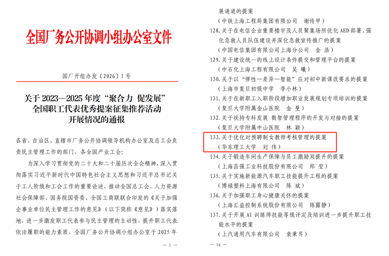 近日,全国厂务公开协调小组办公室通报表扬了2023—2025年度“聚合力 促发展”全国职工代表优秀提案征集推荐活动评选结果。我校教代表、社会与公共管理学院刘伟老师的《优化对预聘制女教师的考核管理建议提案》脱颖而出,成功入选,展现了学校职工代表参与民主管理、建言献策的能力与扎实成效。该提案同时获得上海市总工会2023-2025年度十佳职代会提案。