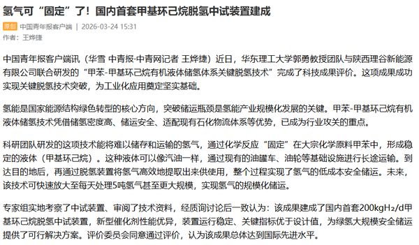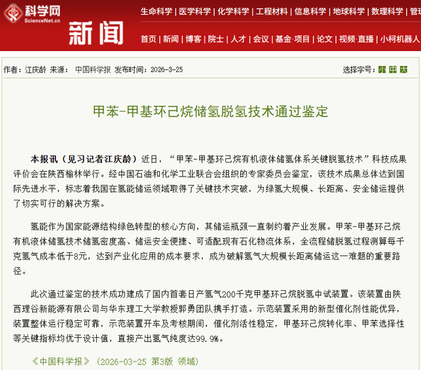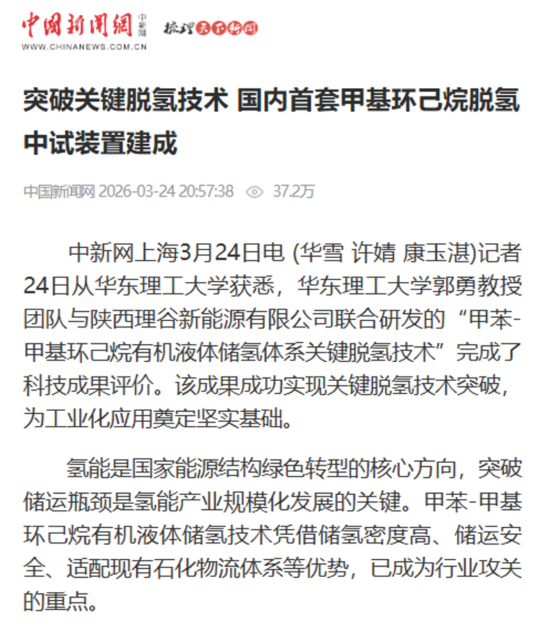 近日,“甲苯-甲基环己烷有机液体储氢体系关键脱氢技术”科技成果评价会在陕西榆林举行。经中国石油和化学工业联合会72小时考核及组织的权威专家委员会鉴定,该技术成果总体达到国际先进水平,标志着我国在氢能储运领域取得了关键技术突破,为绿氢大规模、长距离、安全储运提供了切实可行的解决方案。《中国科学报》《中国化工报》《解放日报》、光明日报客户端、中国青年报客户端、中国新闻网、解放·上观、文汇·上观、科学网APP、中化新网、新民·上观、东方网、上海教育新闻网、上海科技报、新民周刊、上海教育新闻网、第一教育、广州日报新花城、话匣子等近20家媒体进行了原发报道。本篇选取了部分报道予以转载。