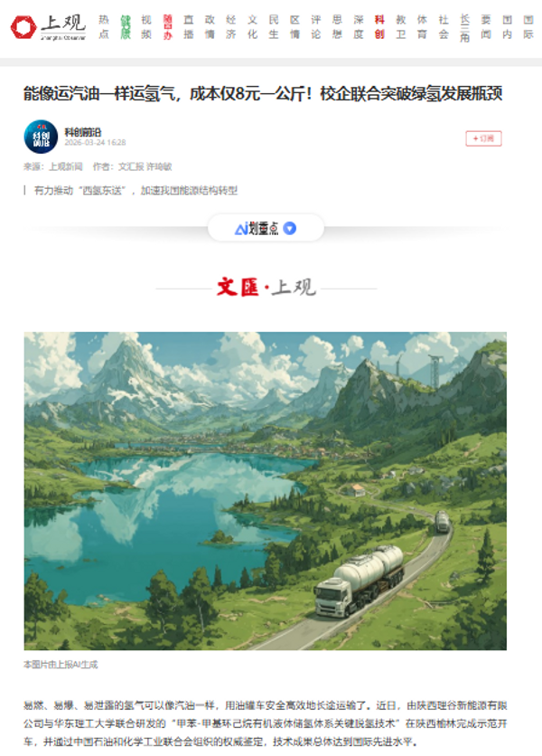 【文汇·上观】能像运汽油一样运氢气,成本仅8元一公斤!校企联合突破绿氢发展瓶颈
