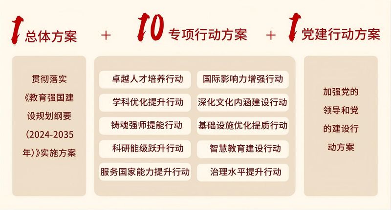 系统集成、整体推进,方能行稳致远。学校精心构建“1+10+1”贯彻落实教育强国建设规划纲要体系化落实方案,即1个总体实施方案、10个专项行动方案、1个党的领导和党的建设行动方案。